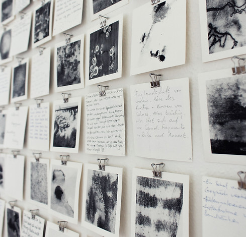 Die Mehrdeutigkeit der organischen Formen und Strukturen der entwickelten Bilder wurde mittels dieser Frage getestet. Die mit der Post ausgeschwärmten Drucke wurden im Rückzug mit Antworten beschrieben und im Anschluss zu einem interaktiv lesbaren Bild vereint.